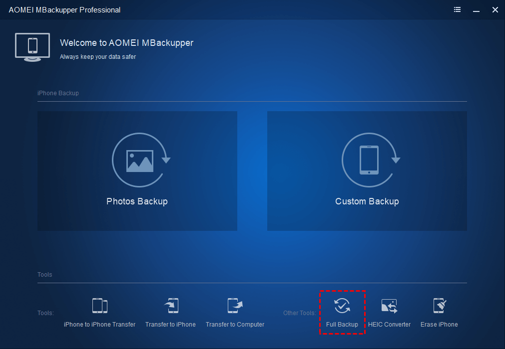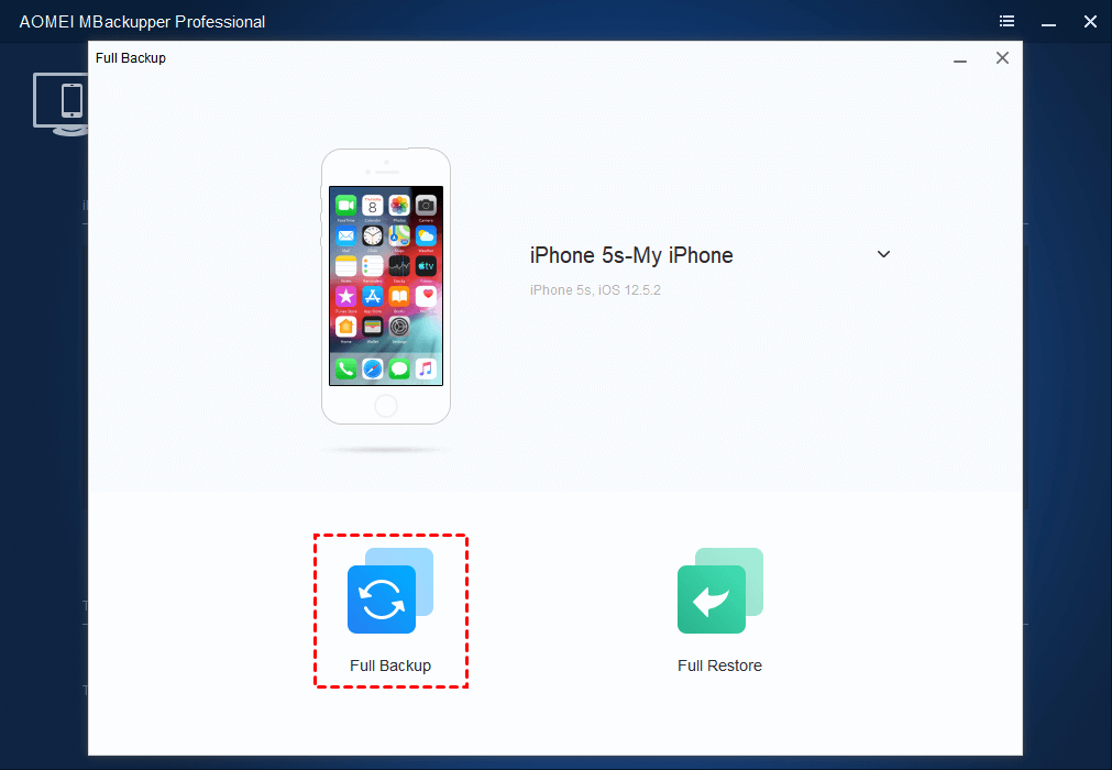 The Full Backup function in AOMEI MBackupper helps you to backup everything on iPhone, which is pretty useful when you need to factory reset your iPhone or restore iPhone data to a new iPhone. Here are the steps.