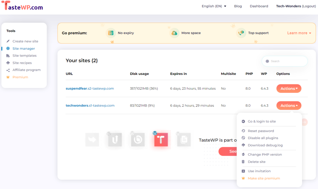 Additionally, registration affords you full management over your created test sites. Within the TasteWP Dashboard, the Site Manager interface offers a comprehensive view of your test sites, including details like their expiration, PHP and WordPress versions, multisite functionality, and storage usage.