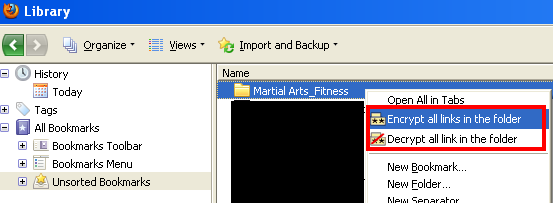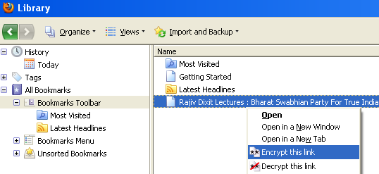 - Just pick any of your desired bookmarked links or even the whole folder you want to encrypt and right click on it which will show either ‘Encrypt this link’ or ‘Encrypt all links in this folder’ respectively.