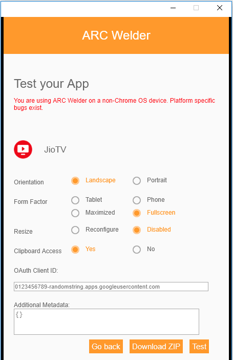 Step 6. After choosing the correct setting to Run JioTV on PC, just click on “Test” button and the ARC Welder tool will run the JioTV app in a new window.