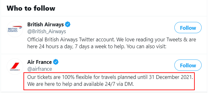 Today, many travelers hesitate to book international flights due to ever-changing COVID travel regulations. Knowing about this issue, Air France Airlines rewrote its Twitter bio – the company informed travelers that their tickets are 100% flexible. In such a way, the company eliminated concerns and convinced Twitter users to consider booking a flight.