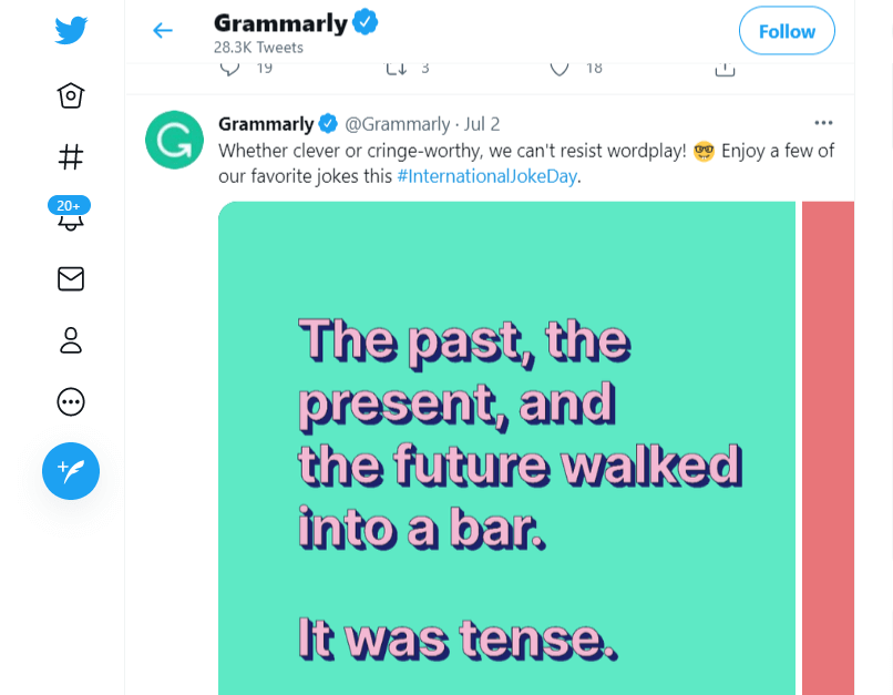 Grammarly, an online grammar checking app, engages students, writers, editors, translators, and other professionals involved in writing on social media through diverse social media content. The company shares expert writing tips, statistics, infographics, and jokes that resonate with the target audience.