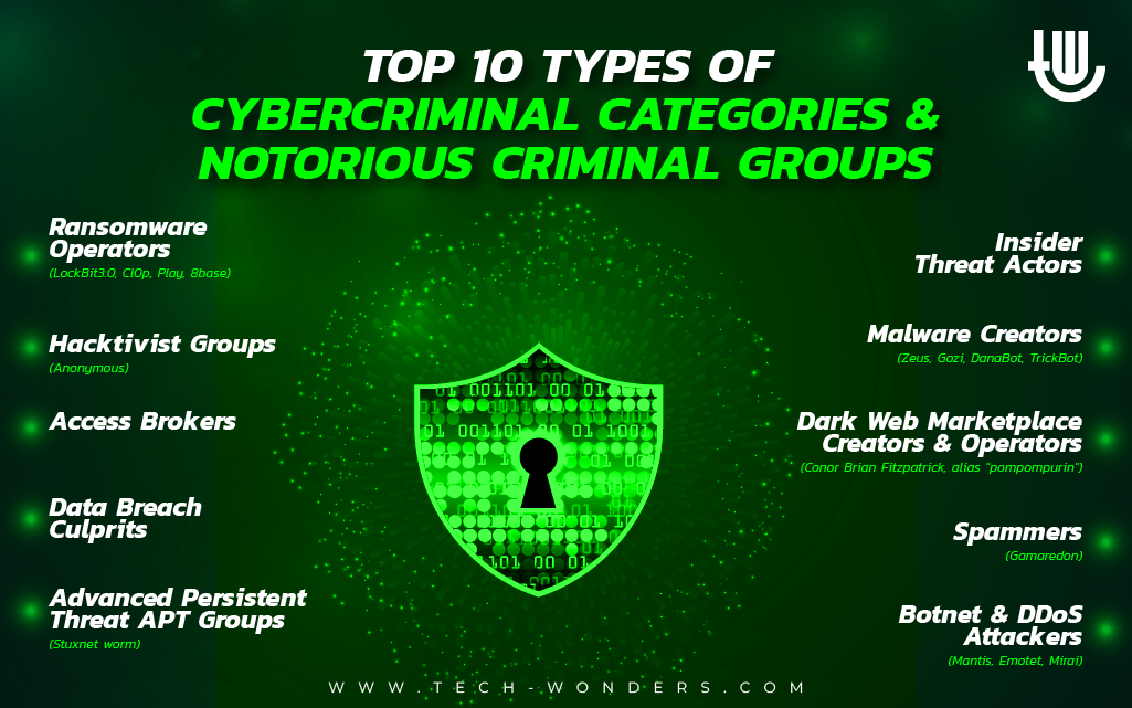 Cybercriminals are most undoubtedly wanted for their cybercriminal activities, causing havoc and disruptions amongst organizations. This can imply a variety of activities, such as data encryption, data theft, or denial of services. Motivated by a variety of reasons, mostly financial or political agendas, we have tried to enlist the top 10 types of cybercriminal categories and notorious criminal groups.